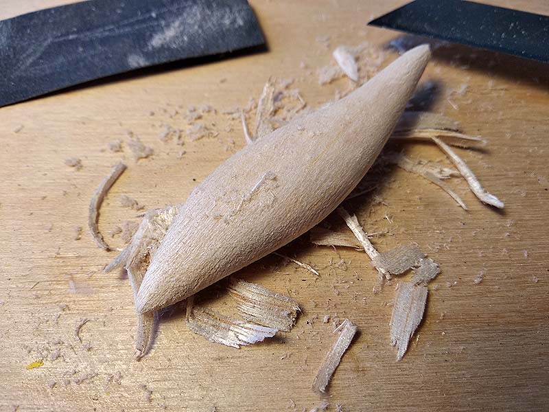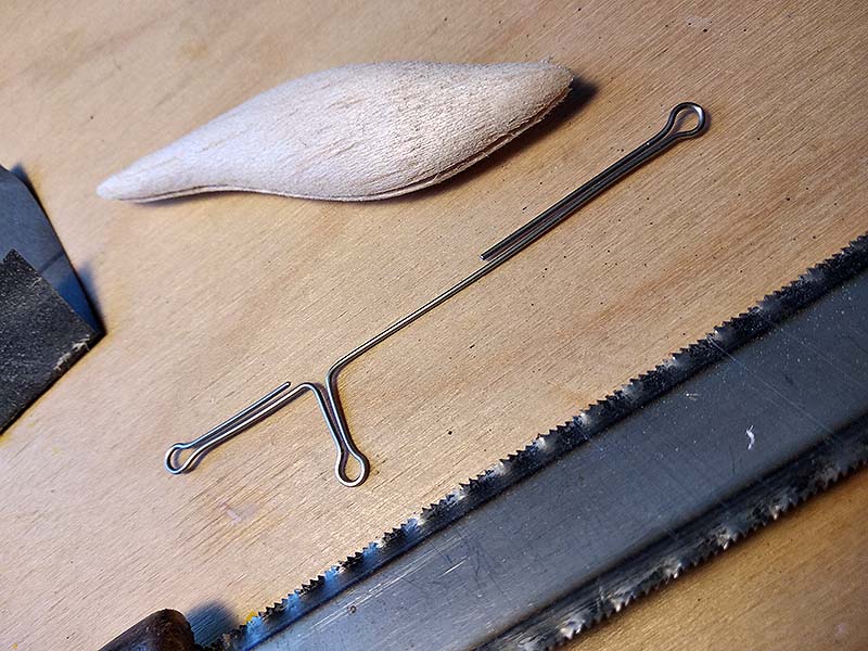 A simára csiszolt, balsafából faragott nyers testet először középen, a hasa mentén, nagyjából a középvonalig bevágom egy vékonyabb fémfűrésszel. A vájatot egy vastagabb fűrészlappal szélesítem, majd csiszolóvászonnal letisztázom.