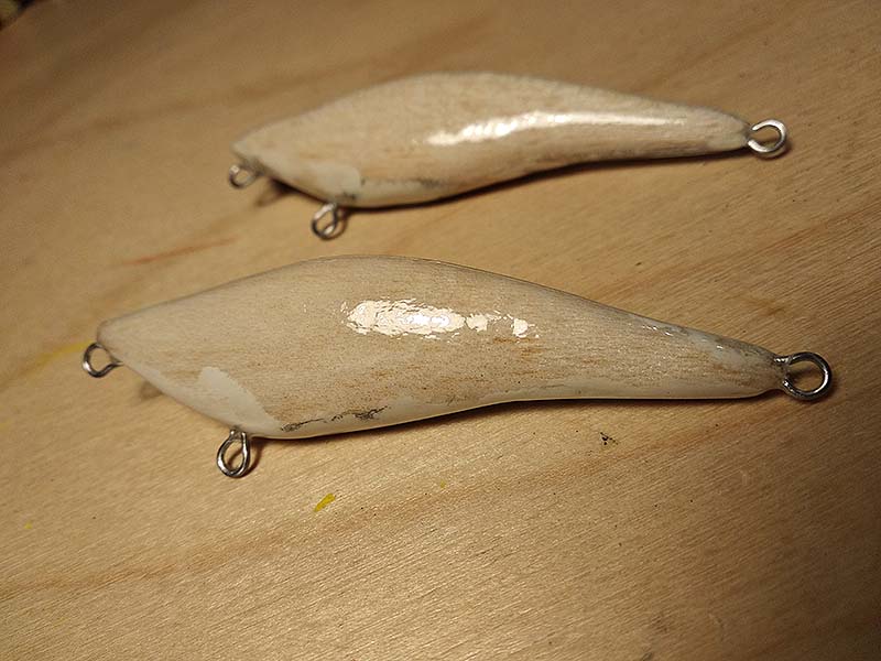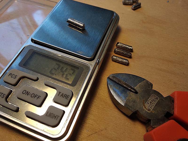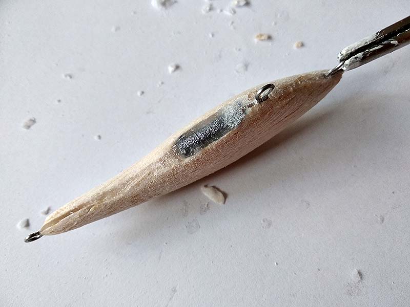 A fahalak hasába kerülő ólmot házilag öntöm. Hulladékólmot olvasztok meg, a forró fémet pedig keményfába fúrt öntőformába csöpögtetem. Az így készült rudak nem tökéletesen homogének, nem is egyforma méretűek, de gyorsan nagy mennyiségben készíthetőek el. Egy ékszermérleggel pontosan kimérem a wobblerbe szánt mennyiséget, ez kerül majd a hasüregbe fúrt lyukba. A puha balsafa hajlamos kiszakadni fúrás közben, ezért fordított állásban használom az akkus fúrót, így készül el az ólom befogadására alkalmas üreg.