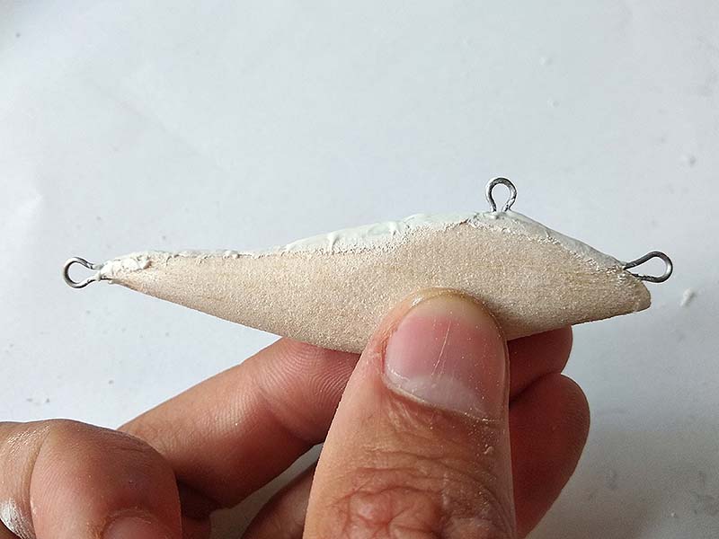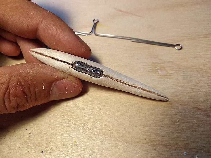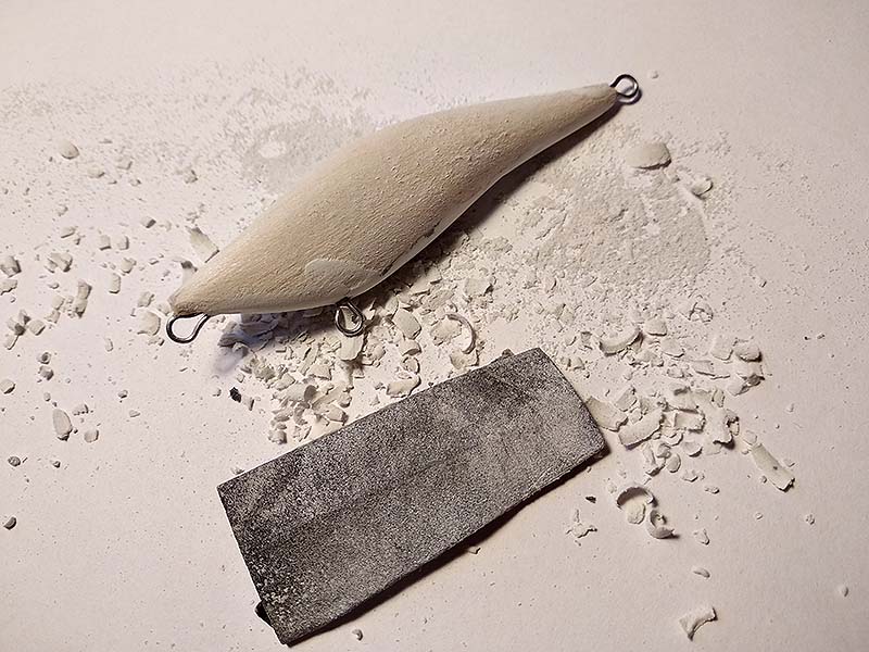 A drótot és az ólomsúlyt pillanatragasztó és szódabikarbóna keverékével ragasztom be. Ezt az ötletet több amerikai csalikészítő videójában láttam, és számomra számos előnnyel jár. Ugyanakkor a módszer alkalmazása igényel némi gyakorlatot. Az üregbe egy szikével szódabikarbónát szórok, nagyjából a feléig kitöltve azt. Érdemes előtte a vájatot kicsit kiszélesíteni, erre egy ceruza vagy egy tollszár pont alkalmas. A ragasztót – ami szigorúan híg, és nem gél típusú – óvatosan a vájatba csepegtetem. Szépen látszik ilyenkor, hogy a ragasztó egy része átjárja a balsafát, illetve betonkeményre köt: cementként működik, a sóder pedig a szódabikarbóna. Ezután ismét kis szódabikarbóna következik, és ha szükséges még pár csepp ragasztó. Fontos, hogy ne töltsük túl a vájatot, hiszen akkor csiszolhatjuk és faraghatjuk le a fölösleget ragasztás után. Az így keletkezett rögzítés bivalyerős, pláne, ha az orrnál és a faroknál is megerősítjük azt. Szintén előny, hogy nagyon gyorsan lehet haladni, ám vigyázni sem árt, hiszen a cianoakrilát nem barátságos anyag. Védőmaszkban és védőszemüvegben dolgozok, mivel kötés közben hő és szúrós szagú gázok keletkeznek, igaz nagyon kis mennyiségben. Sőt néha előfordul, hogy egy apró csepp kifröccsen, és ha a szembe jut, az bizony nem kellemes. Tanúsíthatom J. Továbbá érdemes egy edény vizet és papírkendőt odakészíteni. Ha a ragasztó az újunkra kerül, azonnal vízbe mártva még leoldódik a nagyja.