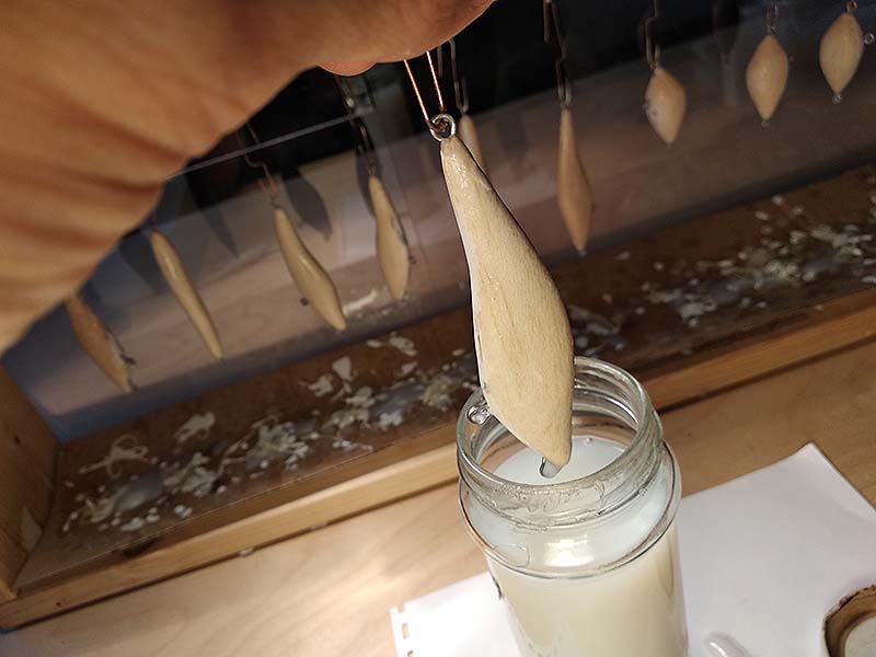 A test ezután négy réteg vízbázisú lakkot kap. Az egyes rétegek közt szintén visszacsiszolom a felületet, mivel a lakk kihozza a fa erezetét, kissé feláztatja azt. Az első mártáskor hosszabb ideig tartom a híg lakkban a testet, így van ideje annak átjárni a fát. Az egyes rétegek utáni csiszolás szép lassan egyre simább felületű testet ad, míg végül hibátlan, fényes és homogén felszínt kapok. Időigényes és kissé pepecselős munka ez, pláne nagyobb darabszámnál, de a végeredmény miatt bőven megéri a belefektetett energia.