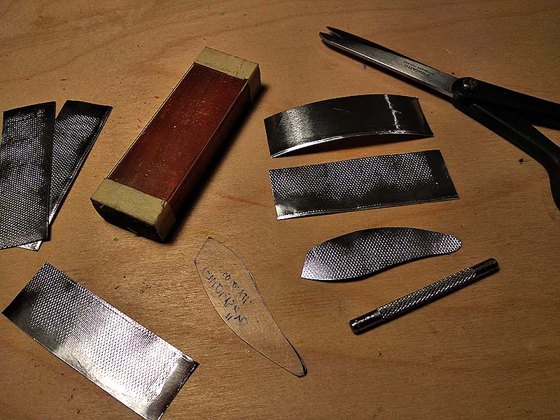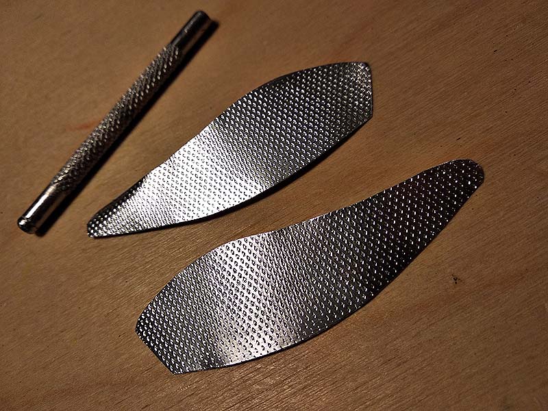 A fényes oldalmatricát sablon alapján vágom ki alumíniumfóliából, amire egy mintázóeszközzel – manikűrös valami nyele – pikkelymintát nyomok, hengerezek. A közben keményre kötött és visszacsiszolt lakkozott testre óvatosan rásimítom az öntapadós fóliát.