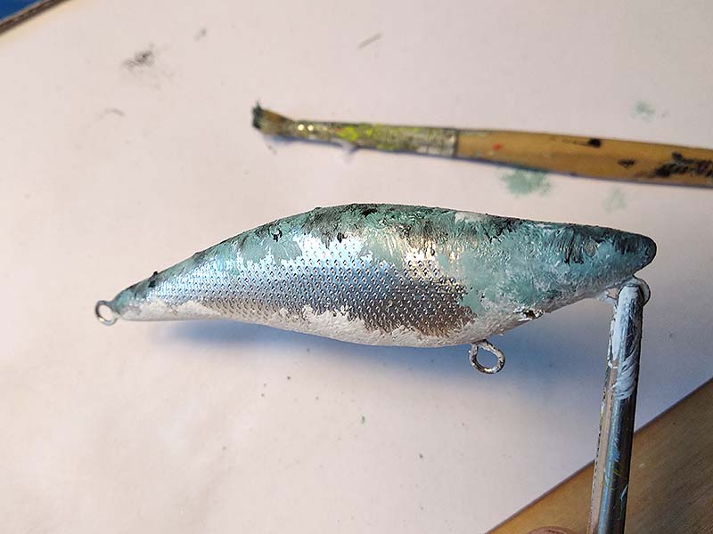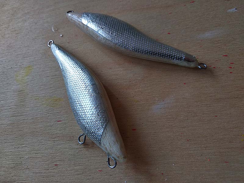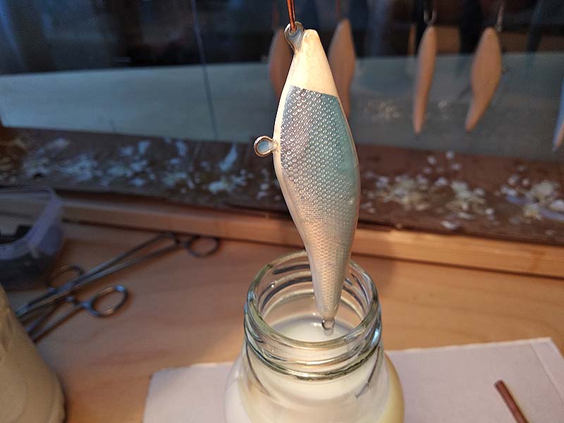 Ezután újabb négy réteg, de ezúttal sűrűbb lakk következik. Kétszer fejjel lefelé, kétszer farokkal lefelé mártok, egy réteg minimum egy napig szárad. Erre azért van szükség, hogy elfedje a fólia éleit, a matrica oldalait, valamint, hogy megadja a test kellő szilárdságát. Egy réteg műgyanta is megoldás erre, ám az szerintem túlságosan elbutítja, megvastagítja a testet. Más csalitípusoknál viszont azt a módszert alkalmazom.
