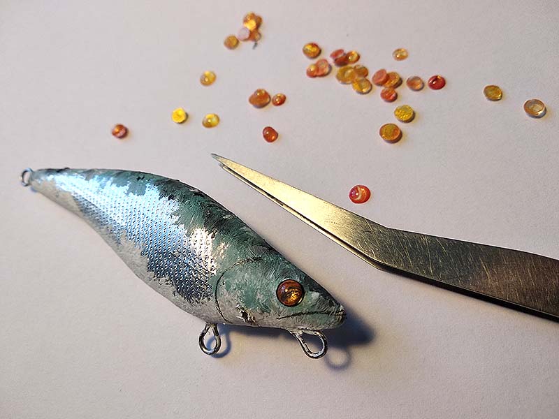 Soha nem használtam airbrusht. Nem tudok betelni a száraz ecset által felhordott színek keveredésével, az ecsetszálak szabálytalanságából adódó apró mintákkal. Ennél a színnél – filé – elsőként fehérrel kezdek a hasi oldalon, a háti részt pedig gyöngyházkékkel, illetve ehhez kevert fekete és fehér festékkel alakítom ki. Az akrilfesték gyorsan köt, így nemsokára már ragaszthatom is az előzőleg elkészített szemeket. Nem szeretem a gyári műszemeket. Igaz, hogy időigényes kissé sajátot gyártani, de a végeredmény kárpótol. Az UV fényre keményedő, műkörmös műgyantából cseppeket nyomok egy műanyaglapra, majd kikeményedés után lepattintom a hordozóról, és a szemek alját akrilfestékkel festem, egyenként. A pupilla – amit egy tű hegyével alakítok ki – csak a szem felragasztása után kerül a helyére, nehogy összefogdossam a fényes fekete pöttyöt. Egy csepp kétkomponensű műgyantával ragasztom fel a kész szemeket a fahal fejére, elkerülendő a később alá beszoruló buborékokat. Ezután jön pár ceruzával rajzolt, stilizált vonal száj, kopoltyúív és mellúszó gyanánt, valamint a kis logó-matrica felragasztása a hasi oldalra.