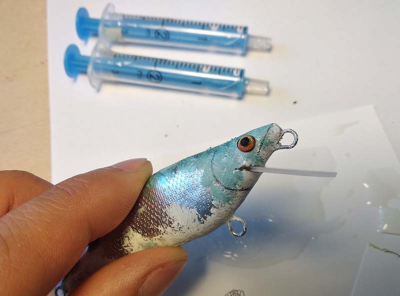 Mindenki máshogy gyantázik. Én maszkban és lehetőleg minimális hulladék generálásával. Elsőként egy pár cseppel ragasztom be a terelőlapot, és miután megkötött, jöhet a test gyantázása. A fecskendőkkel kimért, kellő mennyiséget kartonlapra nyomom, itt óvatosan, lehetőleg minél kevesebb buborék keletkezésével összekeverem egy kartoncsíkkal. Majd ezzel a kis kartoncsíkkal hordom fel a megfestette csalira, folyamatosan forgatva, figyelve, hogy ne maradjon ki sehol.