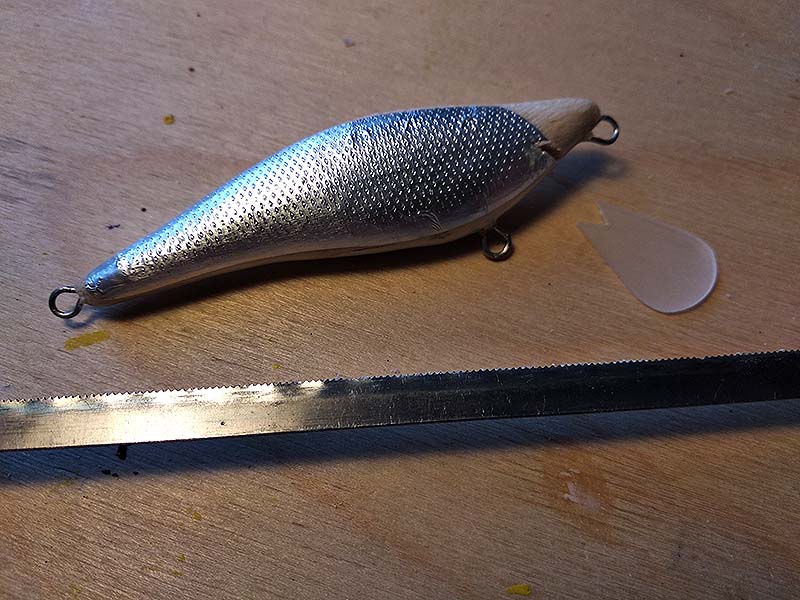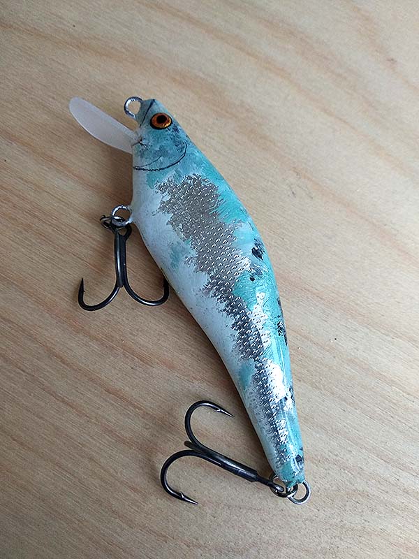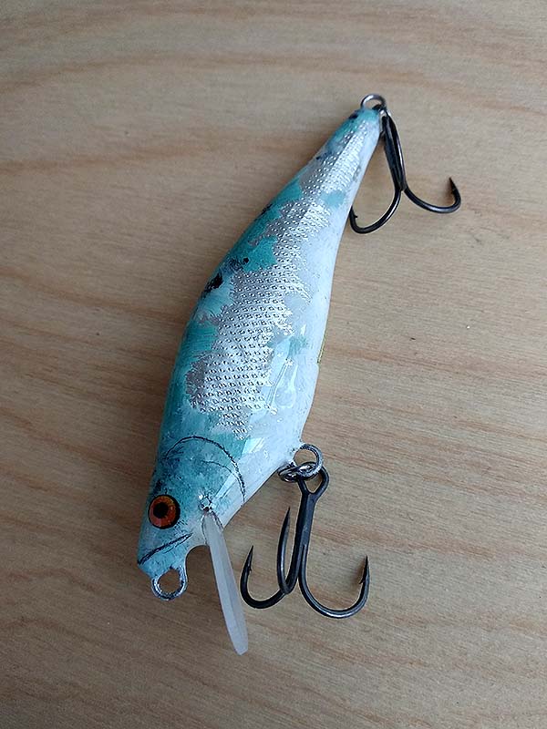 És íme, a befejezett csali, készen a bevetésre. Mivel ezeket a wobblereket nem gép készíti, így előfordulhat némi pontatlanság, és a különböző minőségű balsafa sem egyforma fajsúlyú. Ezért minden elkészült csalit megúsztatok, letesztelek. Ilyenkor a vonószem óvatos állításával – hangolásával – módosítható a csali mozgása. Ha esetleg enyhén kitér az egyik irányba, akkor a drótfül ellenkező irányba való hajlításával jó útra terelhető a fahal.