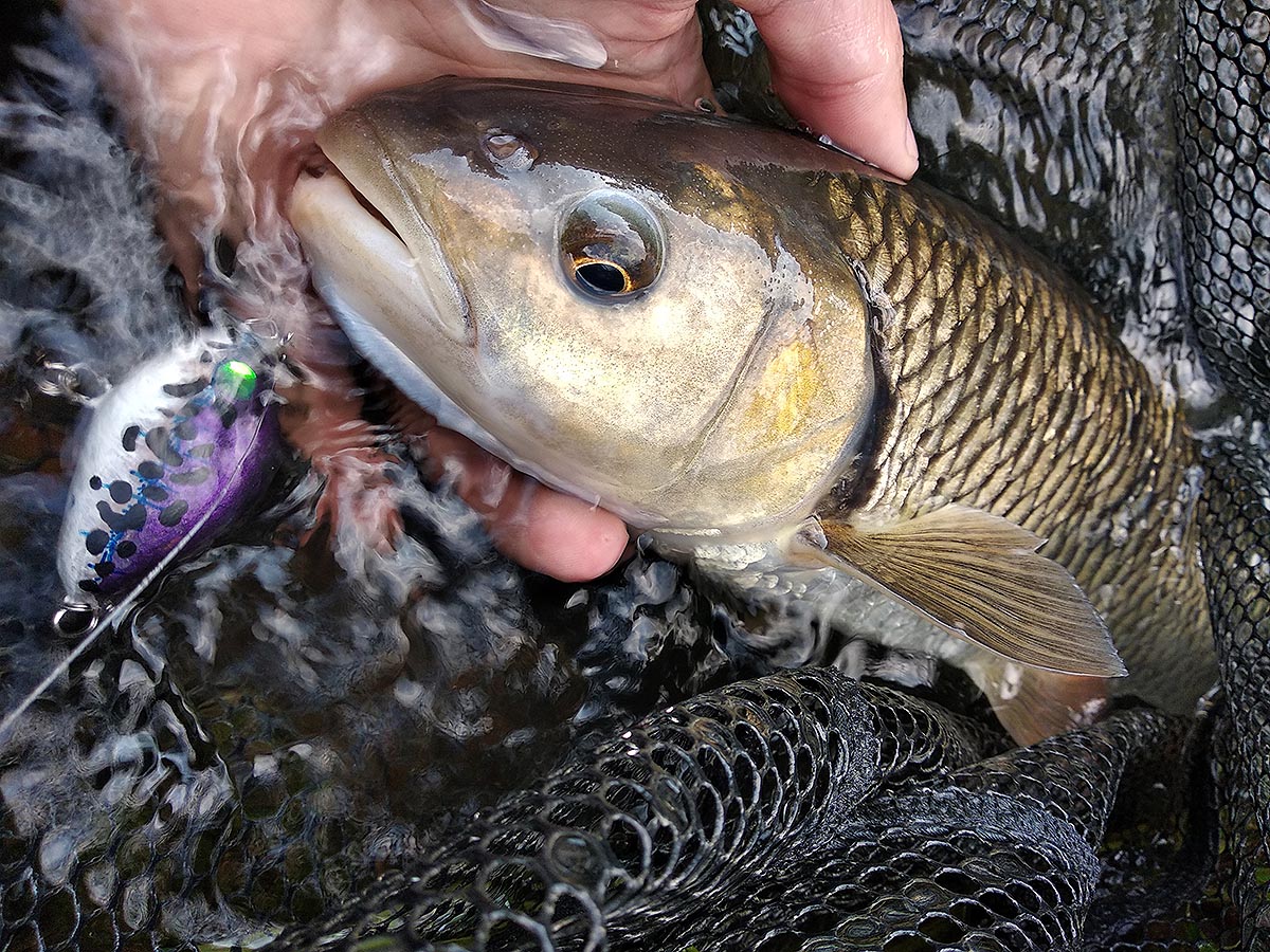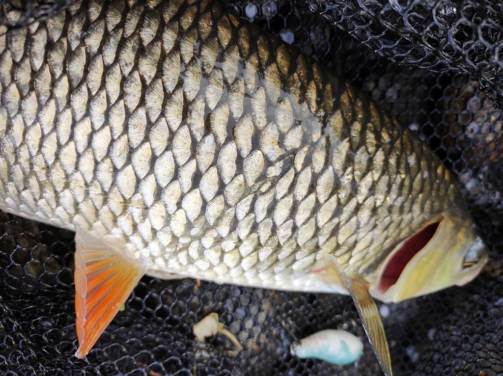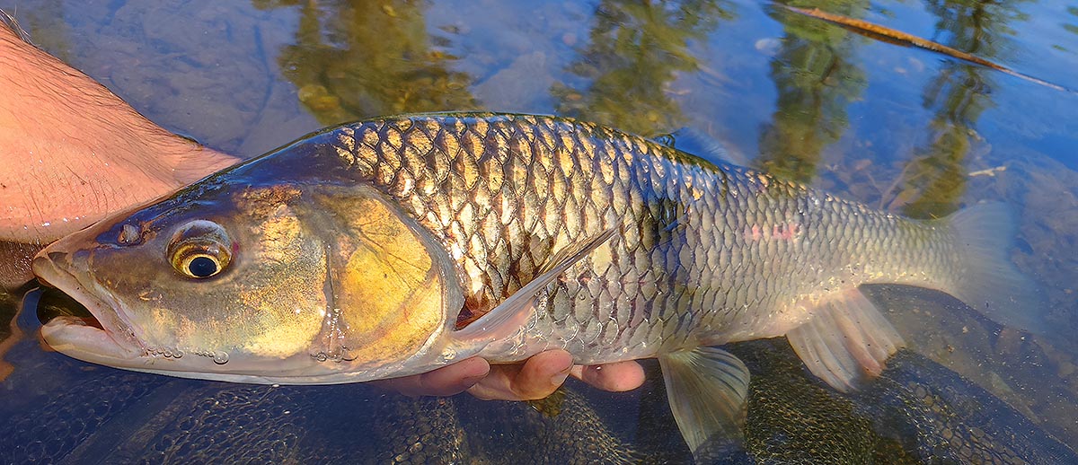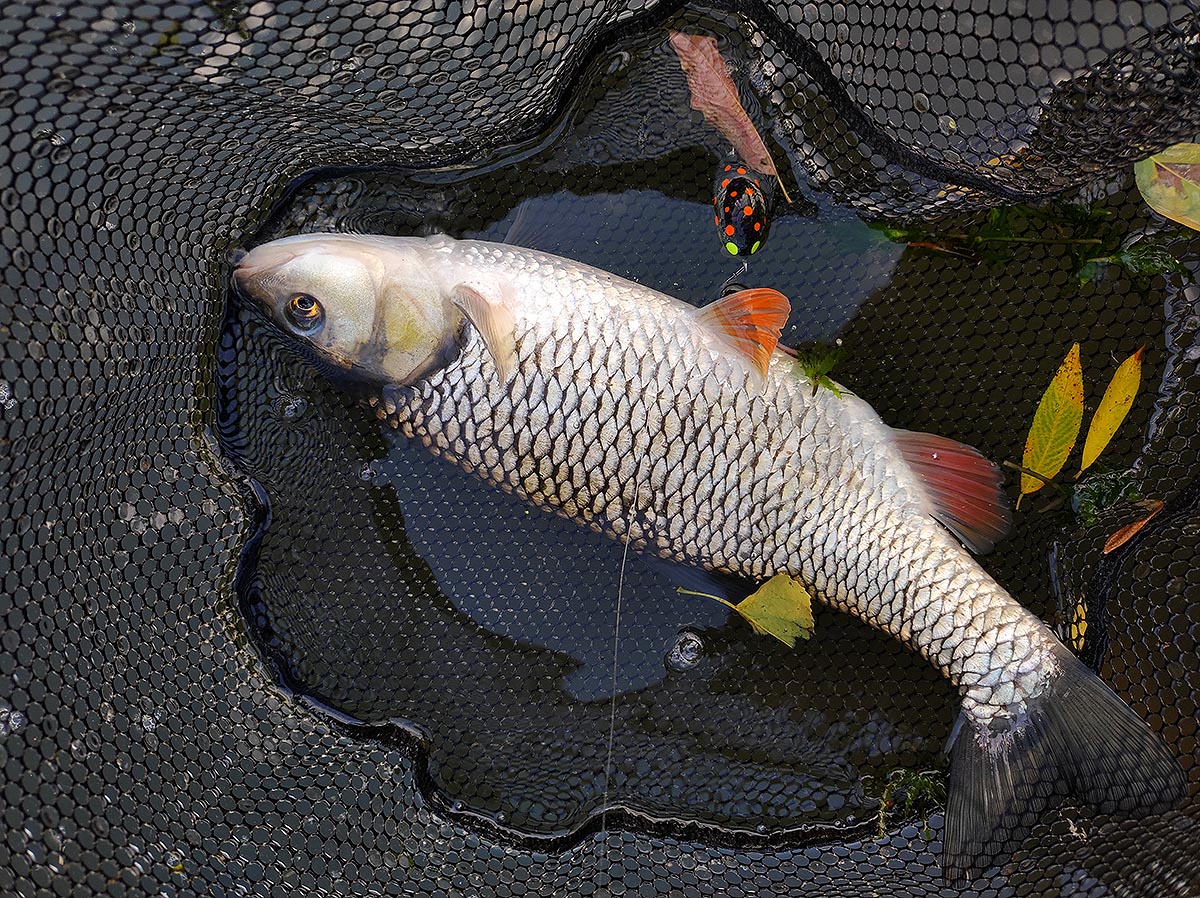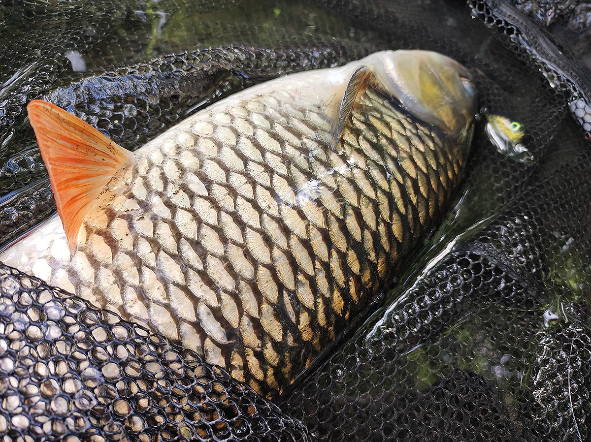 A következő szakaszon messzire a víz fölé nyúló fák szegélyezik a folyót. Ha magasabb lenne a vízállás, esélytelen lenne alájuk dobni, de most be lehet szépen játszani az ágak közé a csalit. Közben a víz közepén két balinrablás durran. Végre! Idén nagyon elkerülnek a fenekeszegek. Sebtiben repül is az fahal, és már messziről rástartól az egyik őn. Tólóhullám gyorsul felé, majd hatalmas rablás, de csak egy pillanatra van meg, leakad. Nagy kár. Vallatom tovább a partmenti fák árnyékos szegélyét. Az első „lékben” nincs érdeklődő, de egy nagy malacot és a körülötte úszkáló kisebbeket észreveszek vízközt. Fura, mintha egymást hajtanák. Másodívás? Az egyik múlt heti domolykó feje dorozsmás volt és ahogy kézbe fogtam folyt belőle a tej. A következő öbölbe dobok, de elmérem, és nekikoppan egy vízből kiálló ágnak a csali. A halk koppanástól három nagy burvány jelzi, hogy megriasztottam az árnyékban pihenő halakat. De szerencsére nem az a fejvesztve menekülős ijedés-fajta, hiszen amint bepottyan a csali melléjük, máris rábombáz egy böszmeség. De elvéti. Kitekerem gyorsan, veszek pár nagy levegőt. Kisimul a víz, látom, hogy visszaállnak a halak, és akkor újra dobok. Egy métert tudom vezetni, de egy lehengerlő erejű kapással lebukkantja valaki a csalit. Rövid tusa a belógó fák és rengeteg ág mellett, majd szákba terelem őt is. Igazi aranyhordó, kövér jószág, méltóságteljesen úszik el fényképezés után.