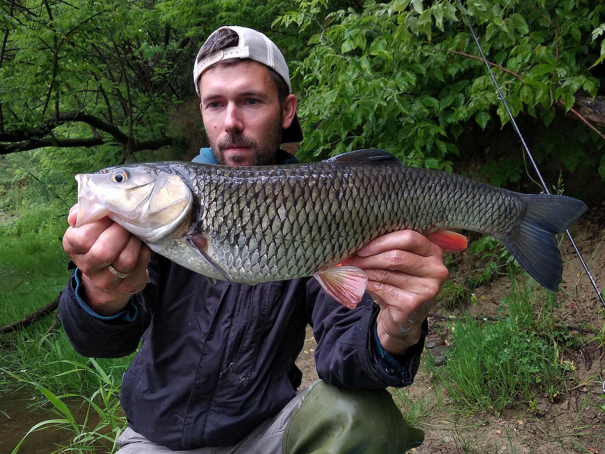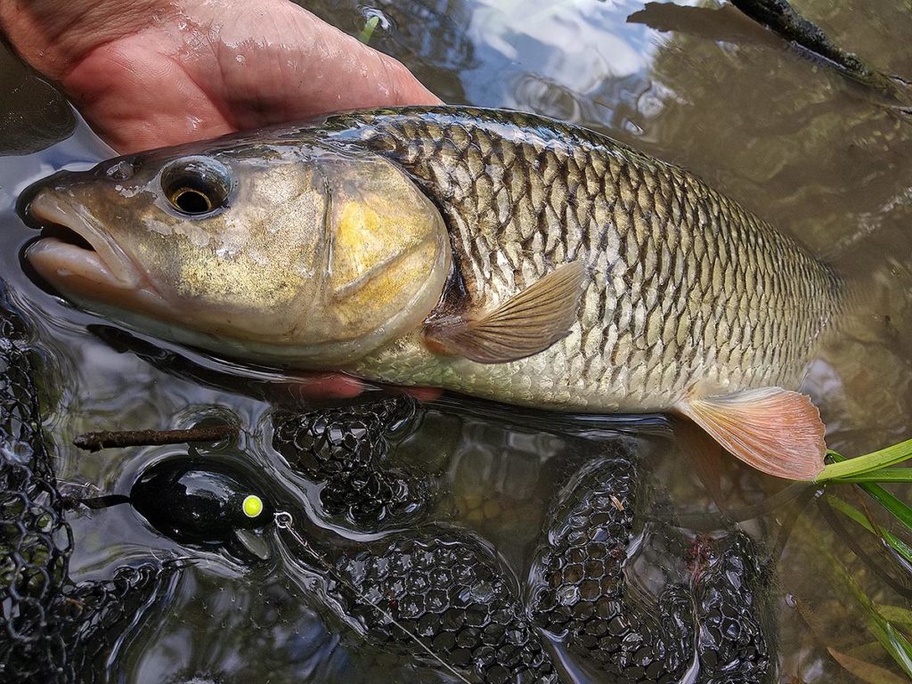 A következő pecán Zolival vallattuk kedvenc szakaszunkat, és bizony csak részeredmények születtek. Jött ugyan pár egyenhal, de az igazán nagyokat – szégyenszemre – nem pergetve fogtam. Miután minden csalimat elhúztam az eperfa alatt lebzselő domolykók előtt, akik meg sem mozdultak értük, megelégeltem a betlit. A kapocsba fahal helyett egy horgot akasztottam, arra felkerült egy faeper, és csak pucéran – freeline fishing – beejtettem a fa alá. Nyilván elsőre levették a nagy domik a finom csemegét, köztük egy személyes rekord 54-es szörnyeteg is. A dolgot odáig fokoztam, hogy a merítővel a kövek közül kihalásztam egy feketeszájú gébet – irtandó tájidegen jószág – és a horogra téve azzal is fogtam nagyot. Hát, örültem is meg nem is. Feloldozást kérek tőletek, remélem megkapom. Mentségemre szóljon, hogy aznap tényleg nem ették a műcsalit a szebbek, Zoli a folyó kiváló ismerője sem tudott igazán nagyot felmutatni. Ja és amúgy nem vallom magam kifejezetten pergetőhorgásznak: feederezni is jó, úszóval pontyozni, csalihallal csukázni, sőt még busázni is szoktam – mentegetőzött hősünk.