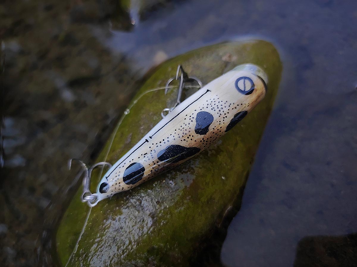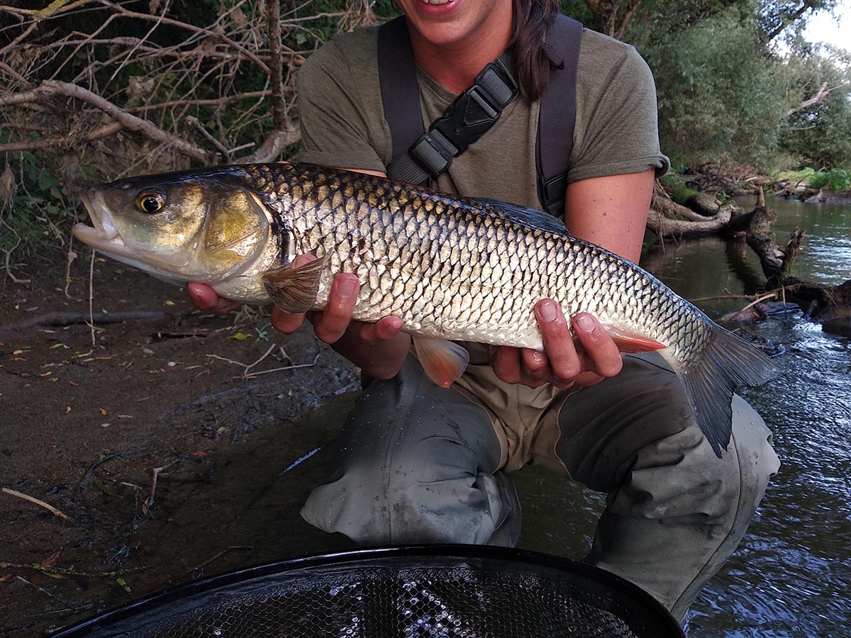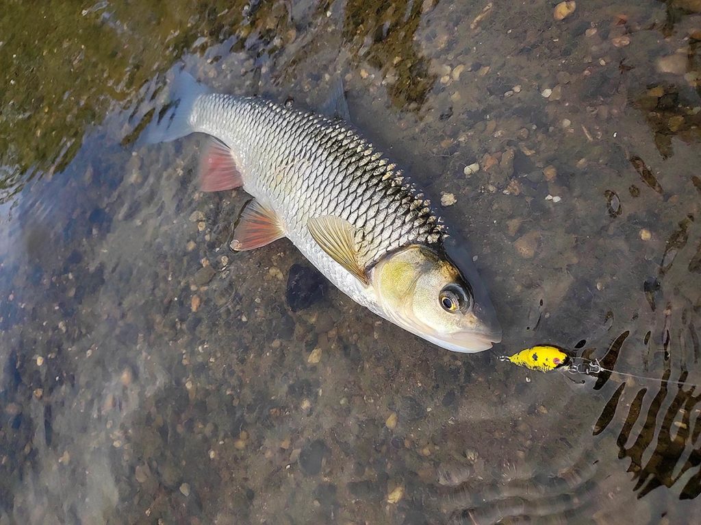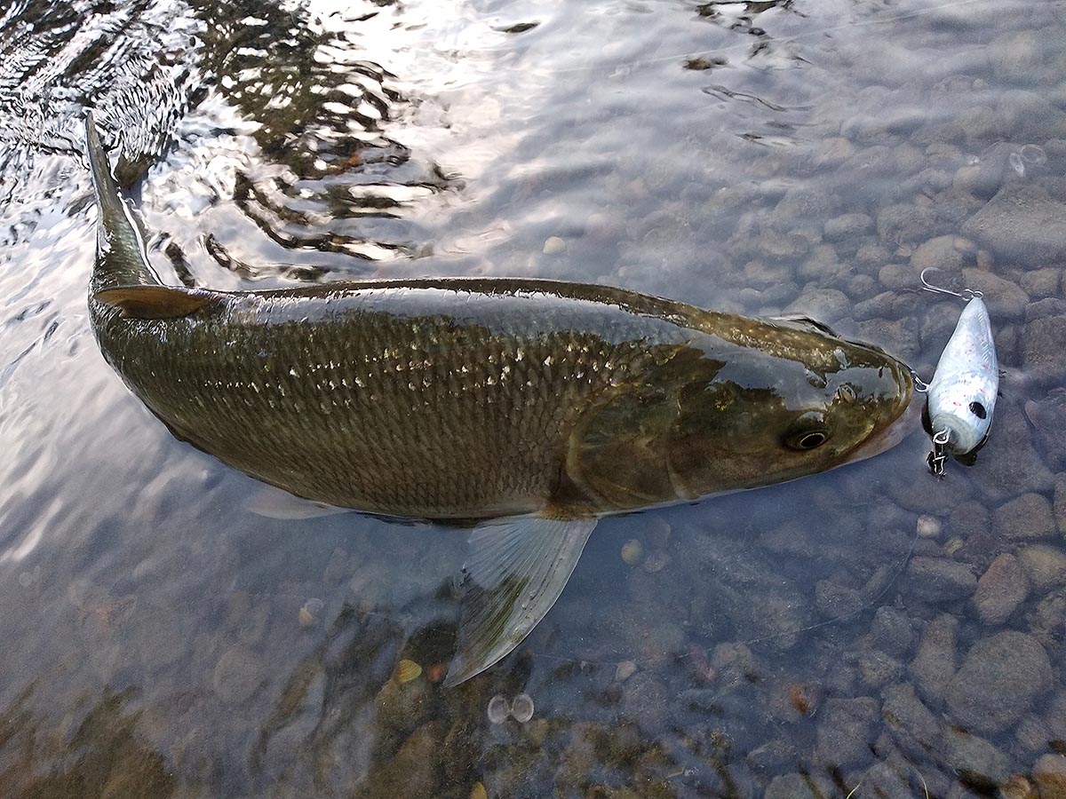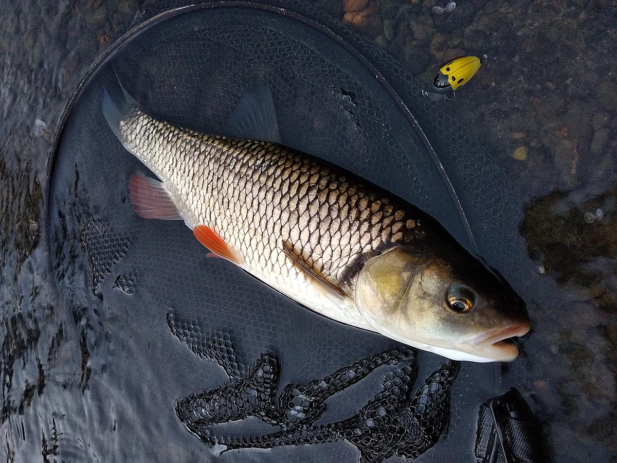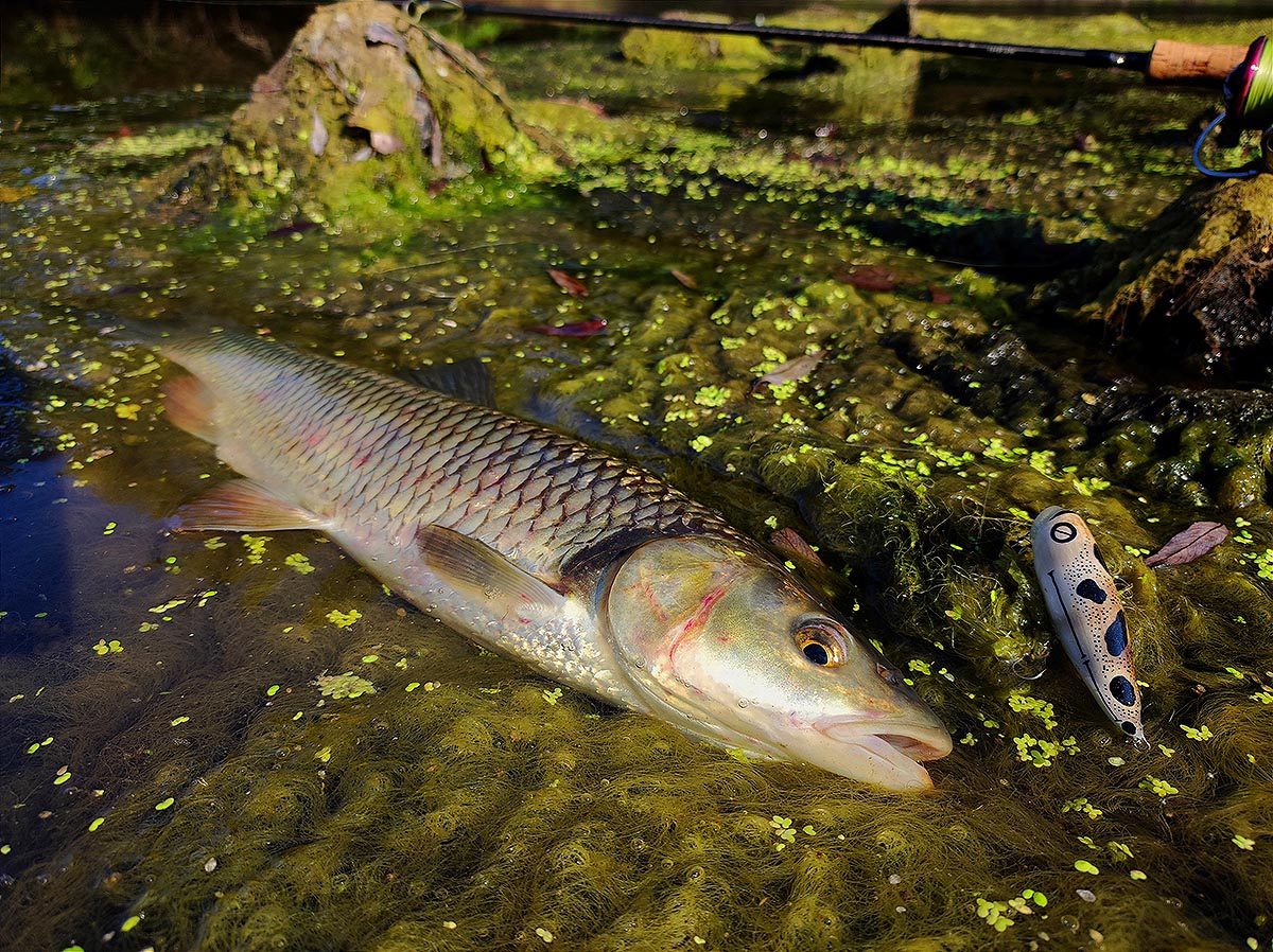 Mélyebb szakasz következik. Közben elhagyom a múlt heti őztetemet, a környék rókái és hollói mára csak a fehér gerincoszlopot és pár lábat hagytak. Nagy lakoma lehetett itt éjjelente a folyó temérdek cifrarákjának is. Két, egymással szemben kidőlt fa töri meg a sodrást, méteresre szűkítve az átjárót. Tökéletes nagyhaltanya! Repül a Plüttyer, de kíváncsiságból nem indítom meg azonnal. Ahogy beesik, egy tolóhullám indul meg az egyik fa alól. Amint odaér, belecuppantók a csaliba, ami nem marad reakció nélkül. Kaffanó hanggal szedi le a következő szép fejes az újszülött – tényleg csak pár órás – csalimat. Az előző ikertesója, olyan 49 és háromnegyed cm :).