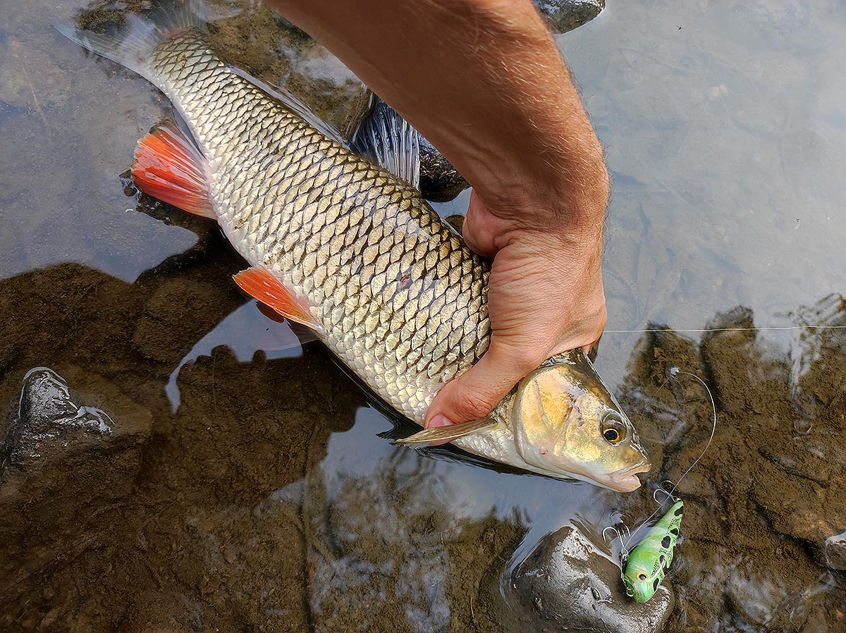 Másnap egy új pályát fedeztem fel. A borzasztó vízhiány szürreális tájat varázsolt a folyóra, de a halak ott voltak. Fenéken legelésző nagy – nagyon nagy – márnák és köztük bóklászó, a műcsalikat totálisan letojó ötvenplusszos domolykók büntettek, amiért viszonylag későn értem a vízhez. Aztán csak összekukáztam pár jobbacskát a bokáig, vagy inkább cipőtalpközépig érő vízből sárga Öcsivel, és Plüttyerekkel.