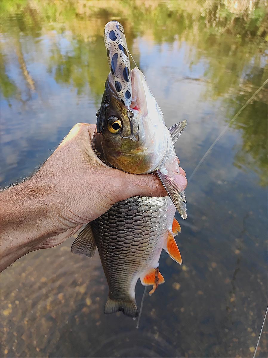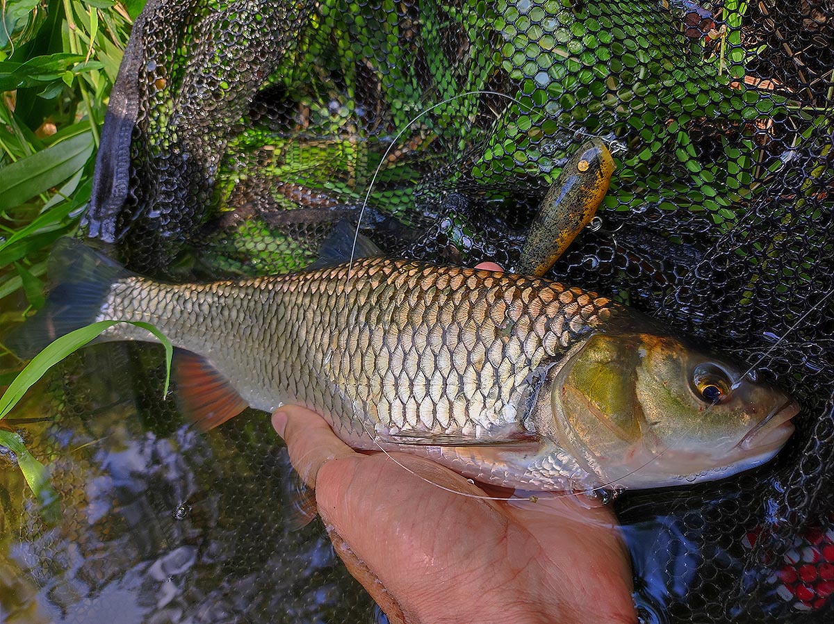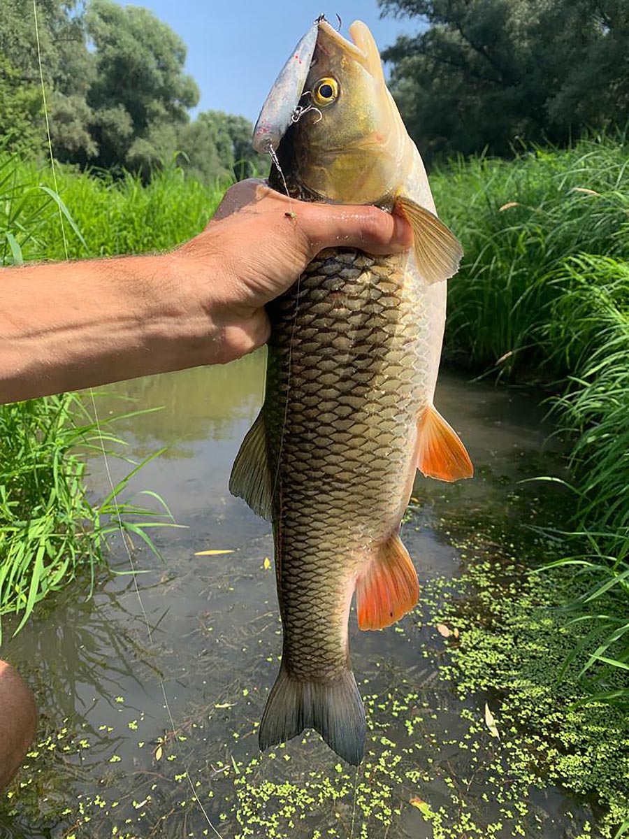 Egy árnyas gödörhöz érve természetesen első dobásra felrobbant a víz a popper alatt, de szokás szerint ütést sem éreztem. Mintha nem lenne horog a csalin. Viszont fogtam pár gyönyörű színű csapósügeret. Imádtam, ahogy a növénnyel borított folyómederből fel-felnyúltak a felszíni csaliért, és hangos cuppogással szedték le azt. Mást el sem tudtam volna amúgy húzni a szinte a vízfelszínig felnyúló tócsagaz és más hínárnövényzet miatt.