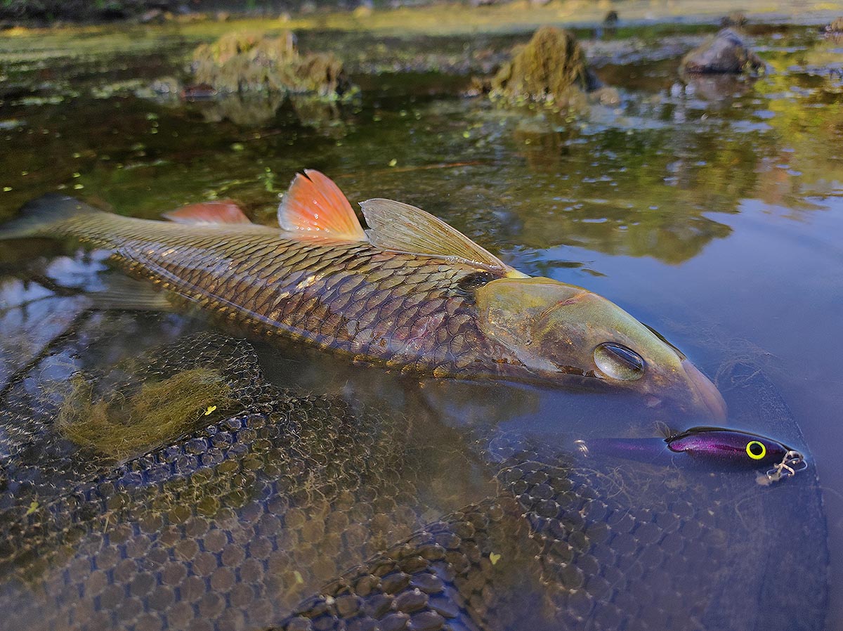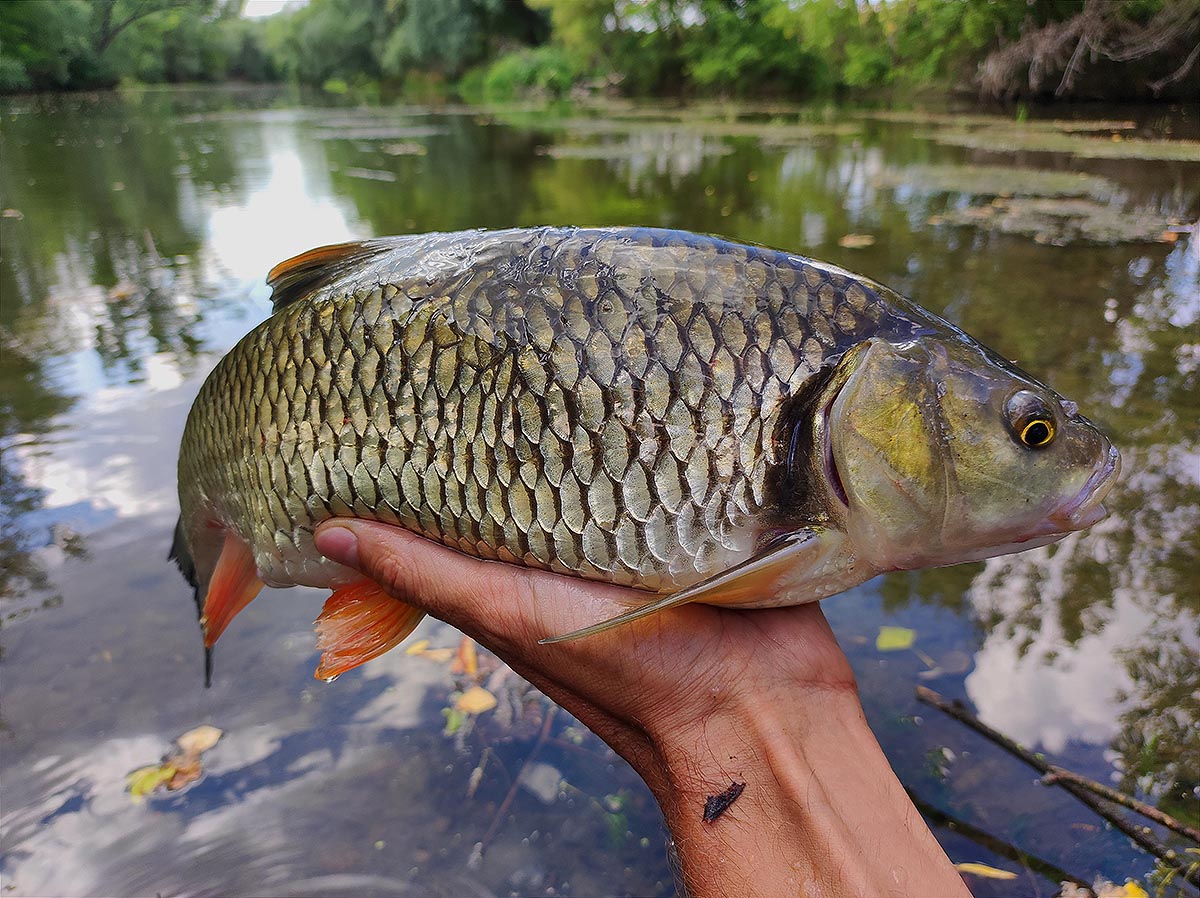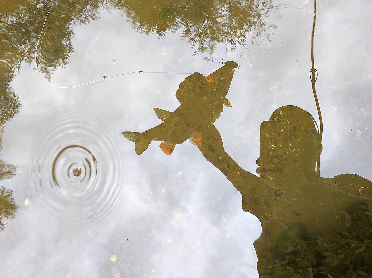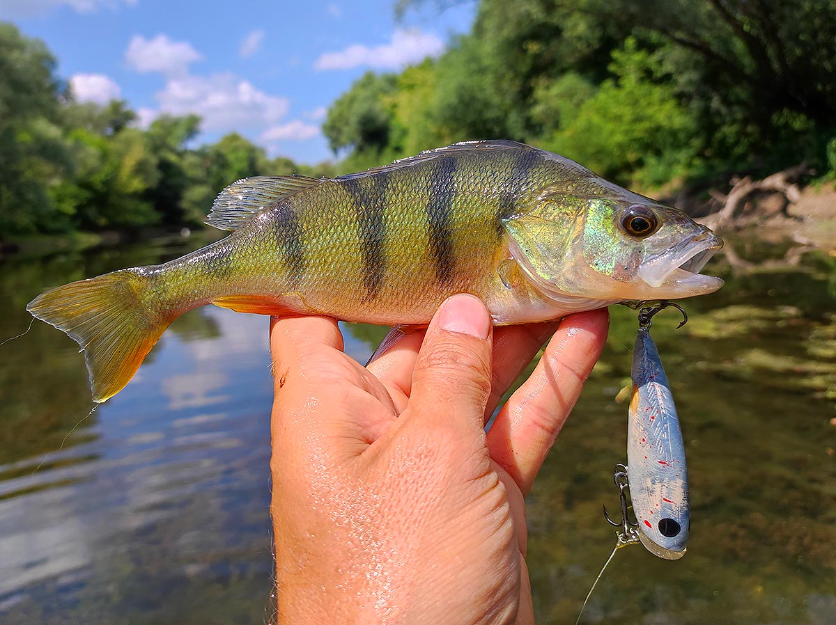 Egy árnyas gödörhöz érve természetesen első dobásra felrobbant a víz a popper alatt, de szokás szerint ütést sem éreztem. Mintha nem lenne horog a csalin. Viszont fogtam pár gyönyörű színű csapósügeret. Imádtam, ahogy a növénnyel borított folyómederből fel-felnyúltak a felszíni csaliért, és hangos cuppogással szedték le azt. Mást el sem tudtam volna amúgy húzni a szinte a vízfelszínig felnyúló tócsagaz és más hínárnövényzet miatt.