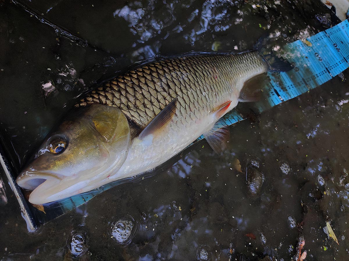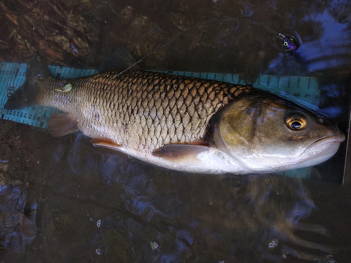 Egy nagyon sekély pályára értem, aminek az alsó részén az éppen csak a vízfelszínt érintő fűzfaág mellett rablásra lettem figyelmes. Valami kirongyolt a gally mögül a lábszárig érő vízben, és a hínársáv mellett lebzselő apróhalat abajgatta. Csöndben odasettenkedtem és repült is a Plüttyer. Egy centit hibáztam, a gallyra felakadt a fahal, de laza mozdulattal lerántottam majd megindítottam. Egy-két csobogás, és felrobbant a nyugodt felszín. Akadt! Az egyik horog a kopultyúfedőbe is beleakadt, ezért a hal még erősebben húzott. Jó kis tusa volt, hosszabb, mint szokott. De kisvártatva a merítőben rázhatta ki magából az új csalit a nap első mérendő hala. 49 és fél :). Szeretem meríteni a halakat. Szerintem mindenkinek jobb így. Néha ugyan csapkodnak a szákban, ami során ugyan a hármashorog néha kibogozhatatlanul beleakad a műhálóba, és bizony egy-két pikkely is lejöhet a halról. De még mindig jobb, mintha elejti az ember, vagy túl erősen szorítja a fej mögött a kifogott pikkelyest. Sajnos láttam már ilyet, mindkettőt, és velem is megtörtént, nem vagyok rá büszke. Ezeket a nagyokat igen nehéz stabilan, ugyanakkor nem túl erősen tartani, hogy azért ne nyomjuk meg a hasát vagy a kopoltyúfedő mögötti részt. Amíg előveszem és megnedvesítem a mérőszallagot, a hal a szákban egy árnyékos részen pihen. Gyors méricske, pár kép, és úszhat is vissza leshelyére.