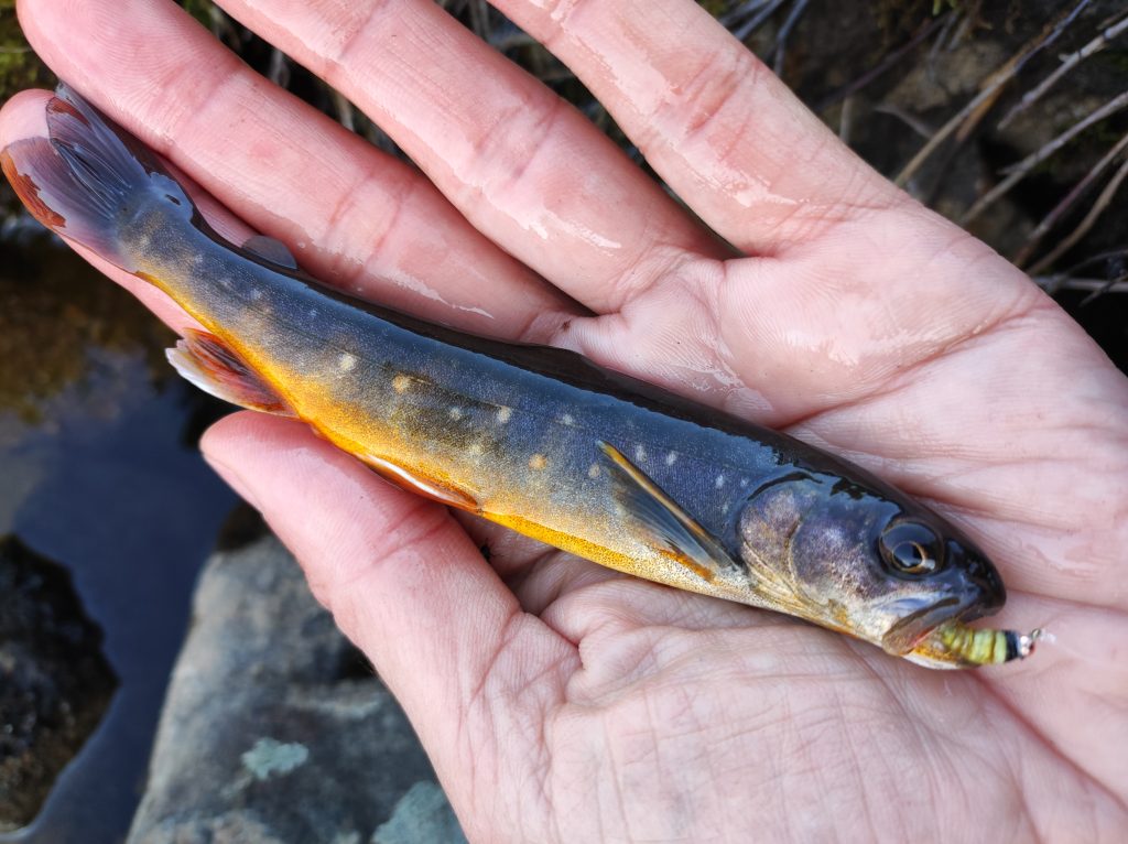 Helyi idő szerint kb. délután ötkor indultunk megkeresni a trail elejét. Előtte még vettünk horgászengedélyt, kölcsönöztünk egy műholdas vészjeladót és kicsit megfáztam én is gyorsan. Eleinte nekem jobban ment a séta. Pé gyenge volt a megfázás miatt, engem hajtott a lelkesedés. Nagyjából négy órát meneteltünk aznap, majd egy kellemes völgyben letáboroztunk. Idilli terület, egy nagyobb patak kanyarog a hegyek közt. Harapunk valamit, és én nem bírok magammal. Összerakom az új botot, és szárazléggyel megfogom az első halakat. Ujjnyi baba-charok. Mintha egy kifestőkönyvből keltek volna életre: olajzöld hát, narancsos has, pettyekkel tarkítva. Mire észbe kapok kb. éjfél van, otthoni idővel számolva hajnal négy. Picit túltoltam. Sorra jönnek az apróságok, nimfára és szárazlégyre is, de nagyobb halat nem látok.