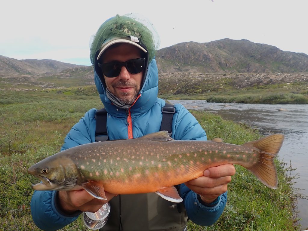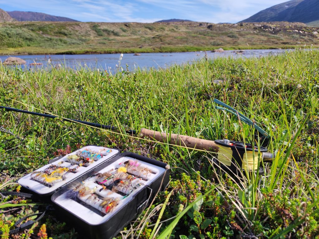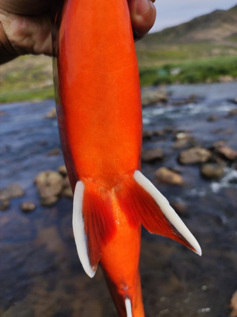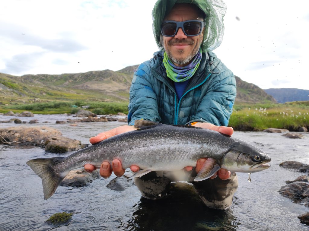 Kipihenten kelek, teljesen hozzászoktam a pár fokban való alváshoz. Izomláznak nyoma sincs, a nátha és a reggeli köhögés is enyhül. Bár lenne zsebkendőm. A domboldalban szedek egy nagy marék bogyót, tüzet rakok és teát melegítek. Mire Pé előkerül, kész a tea. Nyugiban szürcsöljük a reggeli napsütésben. Gyorsan fogok egy chart körforgóval, megpucolom és elmegyek fát gyűjteni. A kvóta hamar összejön, már ropog is a tűz a leves alatt. Beleteszem a frissen szedett tinórút is. Gazdagon bereggelizünk. Bár lehet, hogy inkább koraebéd, nem nézem az órát egy ideje. Jóllakva gázlóruhát öltök és indulok végre legyezni. Az elsőket partról fogom, majd miután szétdobtam a pályát, beállok egy nagyobb kő mögé a jeges vízbe. A halak nem nagyok, átlagos negyvenes charok, de folyamatosan támadják a csalit, van lehetőségem mind a dobást, mind pedig a fárasztást gyakorolni. Egyszer csak ruganyos léptekkel egy alak közeledik. Alacsony figura, talán gyerek, kezében pergetőbotot szorongat. Első gondoltam az, hogy „na, itt a konkurencia”. Elszégyellem magam, nem otthon vagyok. Ahogy megáll egy kiszögellésen és zsinórját gubancolja, még mindig nem tudom eldönteni, hogy nő vagy férfi-e. Kapucniban, moszkitóhálóban van, néha odakapja a fejét, amikor halat fárasztok. Aztán elkezd ő is termelni, de halai nem kerülnek vissza a vízbe. Nagy csobogás, spiccgyűrűig feltekert hal, majd bottal kidobás a partra és azonnali felkoncolás a forgatókönyv nála. Halért jött. Nemsokára telítődök a hellyel, visszasétálok a sátrakhoz. Pár perc múlva jön az alak, kezében egy csokor hal zsinórra fűzve. Int, és valamit magyaráz az idős inuit nő. A napszemüvegemet tálalta meg az ösvényen, leeshetett a sapka, két kapucni és szúnyogháló tetejéről, ahogy visszafelé lehajoltam pár bogyóért. Megköszönöm, majd eltűnik a láthatáron.