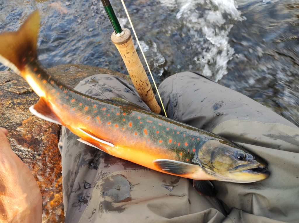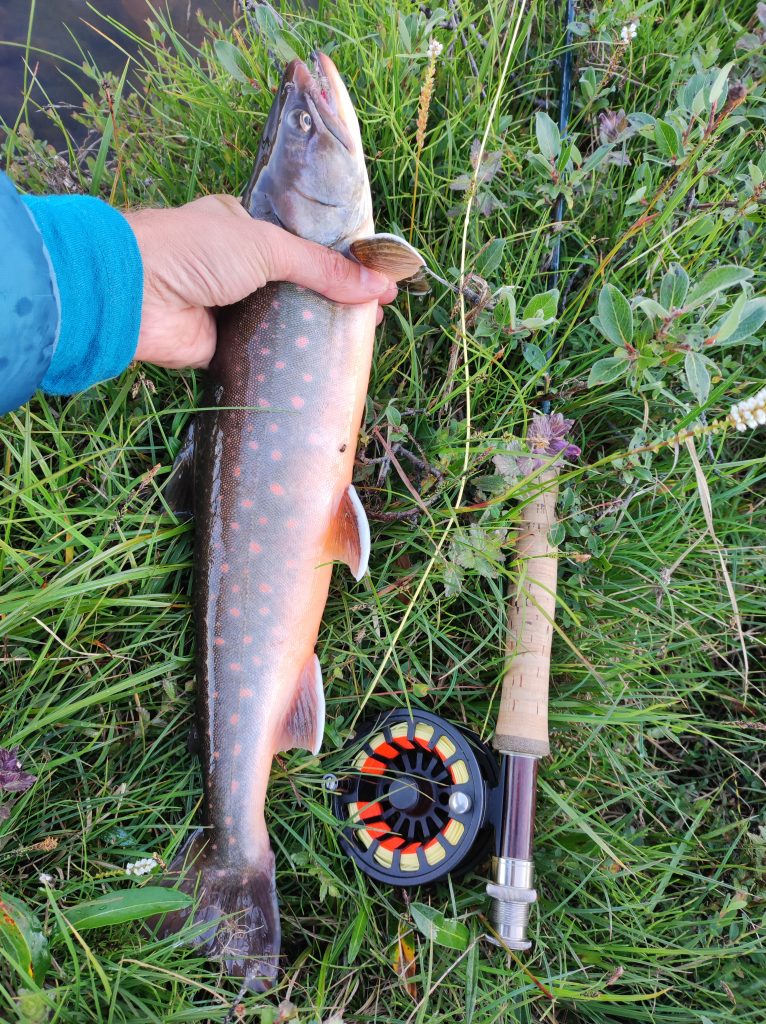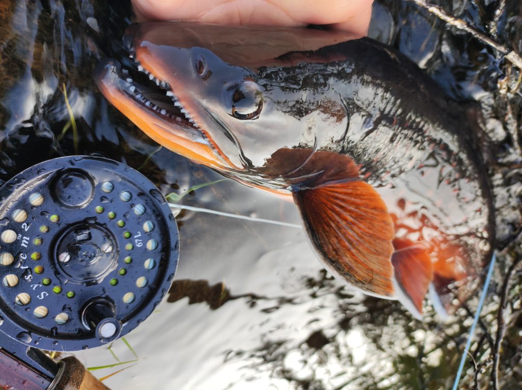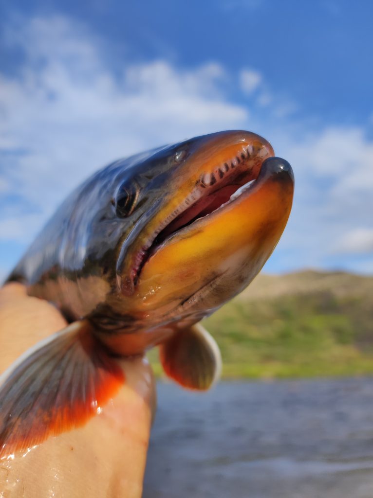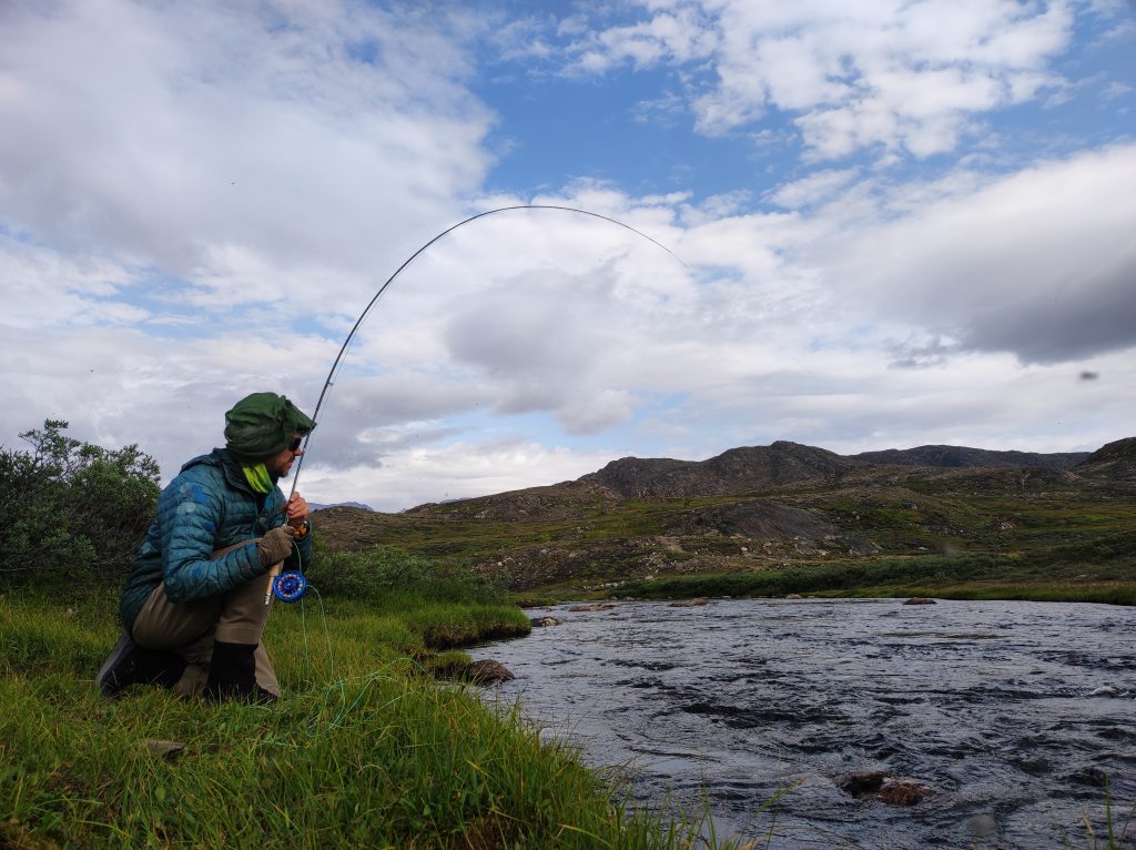 Kipihenten kelek, teljesen hozzászoktam a pár fokban való alváshoz. Izomláznak nyoma sincs, a nátha és a reggeli köhögés is enyhül. Bár lenne zsebkendőm. A domboldalban szedek egy nagy marék bogyót, tüzet rakok és teát melegítek. Mire Pé előkerül, kész a tea. Nyugiban szürcsöljük a reggeli napsütésben. Gyorsan fogok egy chart körforgóval, megpucolom és elmegyek fát gyűjteni. A kvóta hamar összejön, már ropog is a tűz a leves alatt. Beleteszem a frissen szedett tinórút is. Gazdagon bereggelizünk. Bár lehet, hogy inkább koraebéd, nem nézem az órát egy ideje. Jóllakva gázlóruhát öltök és indulok végre legyezni. Az elsőket partról fogom, majd miután szétdobtam a pályát, beállok egy nagyobb kő mögé a jeges vízbe. A halak nem nagyok, átlagos negyvenes charok, de folyamatosan támadják a csalit, van lehetőségem mind a dobást, mind pedig a fárasztást gyakorolni. Egyszer csak ruganyos léptekkel egy alak közeledik. Alacsony figura, talán gyerek, kezében pergetőbotot szorongat. Első gondoltam az, hogy „na, itt a konkurencia”. Elszégyellem magam, nem otthon vagyok. Ahogy megáll egy kiszögellésen és zsinórját gubancolja, még mindig nem tudom eldönteni, hogy nő vagy férfi-e. Kapucniban, moszkitóhálóban van, néha odakapja a fejét, amikor halat fárasztok. Aztán elkezd ő is termelni, de halai nem kerülnek vissza a vízbe. Nagy csobogás, spiccgyűrűig feltekert hal, majd bottal kidobás a partra és azonnali felkoncolás a forgatókönyv nála. Halért jött. Nemsokára telítődök a hellyel, visszasétálok a sátrakhoz. Pár perc múlva jön az alak, kezében egy csokor hal zsinórra fűzve. Int, és valamit magyaráz az idős inuit nő. A napszemüvegemet tálalta meg az ösvényen, leeshetett a sapka, két kapucni és szúnyogháló tetejéről, ahogy visszafelé lehajoltam pár bogyóért. Megköszönöm, majd eltűnik a láthatáron.