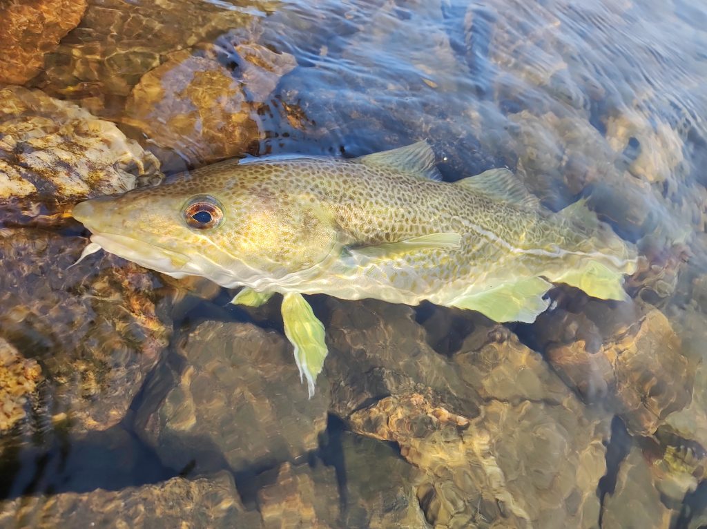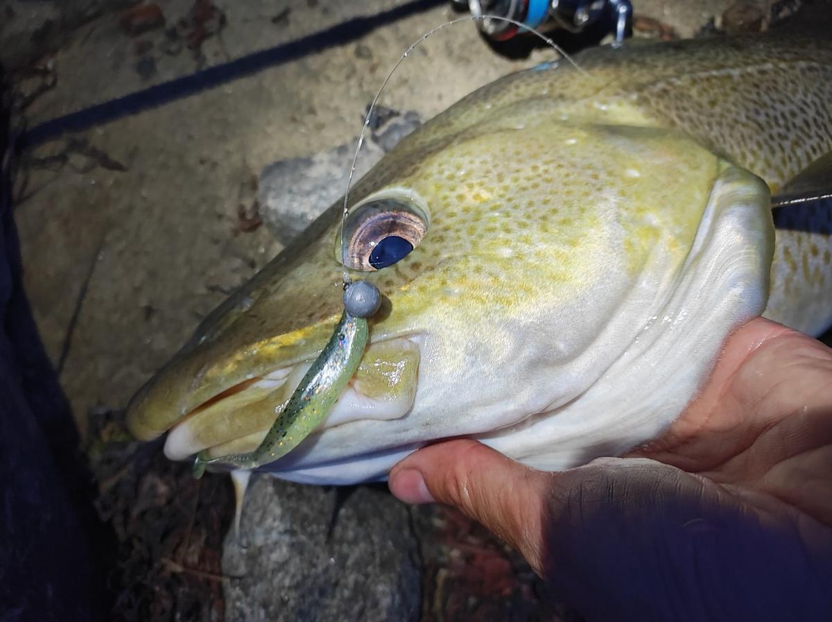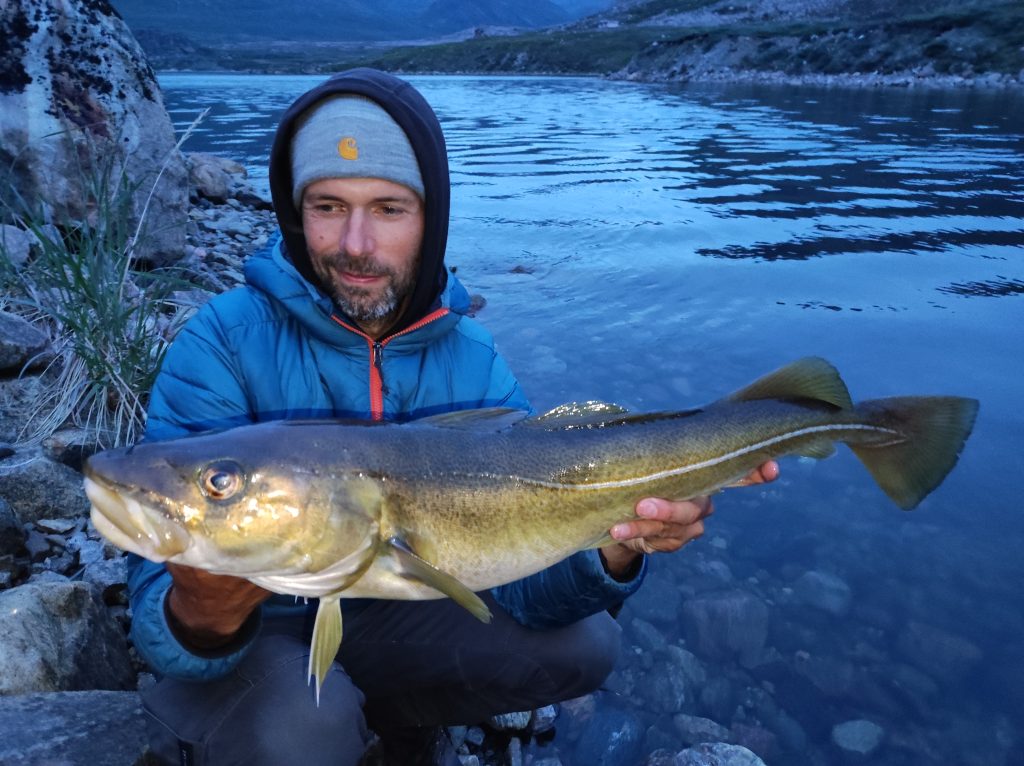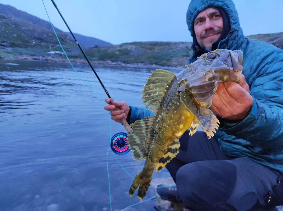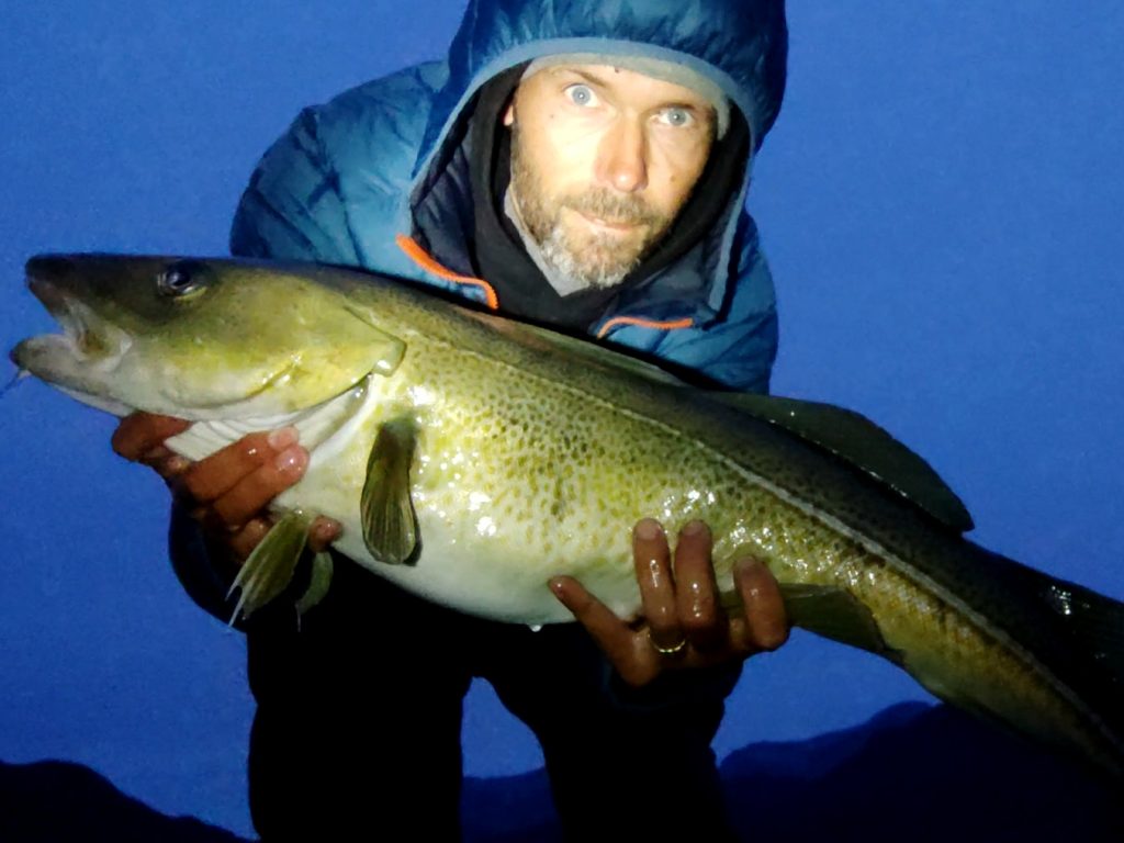 Naponta jó 30 perccel később ért ide a dagály. Elhatározom, hogy utolsó nap kimaxolom a dolgot. Parádésra sikerült a peca. Egy álombeli süllőzéshez lehet talán hasonlítani ezt a fajta horgászatot. Sötétedéskor a partmenti sziklákon egyensúlyozva, a sodorvonal szélre kell dobni a gumihalat. A jig feszes zsinórral süllyed egy darabig, majd a fenéken koppan, beleemelek, és általában második pöccintés után a tehetetlenül süllyedő csalit erős ütéssel veszi le egy bitang ragadozó. Folyamatosan. Pé a codjai mellé megint fogott egy sarki tőkét, és vagy három sculpint is. Léggyel. Azért ez nem hétköznapi. Váltok a legyes cájgra. Közben kiderült, egyel erősebb osztályú zsinór illene a botomhoz, ezért is megy nehezen a dobás. Mögöttem függőleges sziklafal, nem könnyű lengetni, az első dobás elrepül vagy 12 méterre. Belehúzok párat, már közel jár, amikor látom, hogy úszik utána egy hal. Nyílik a nagy fehér száj, és már rá is ragad a kölcsönkapott garnéla-légyre egy cod. Izgalmas fárasztás a lágy felszereléssel, majd kezemben az első léggyel fogott tengeri halam.