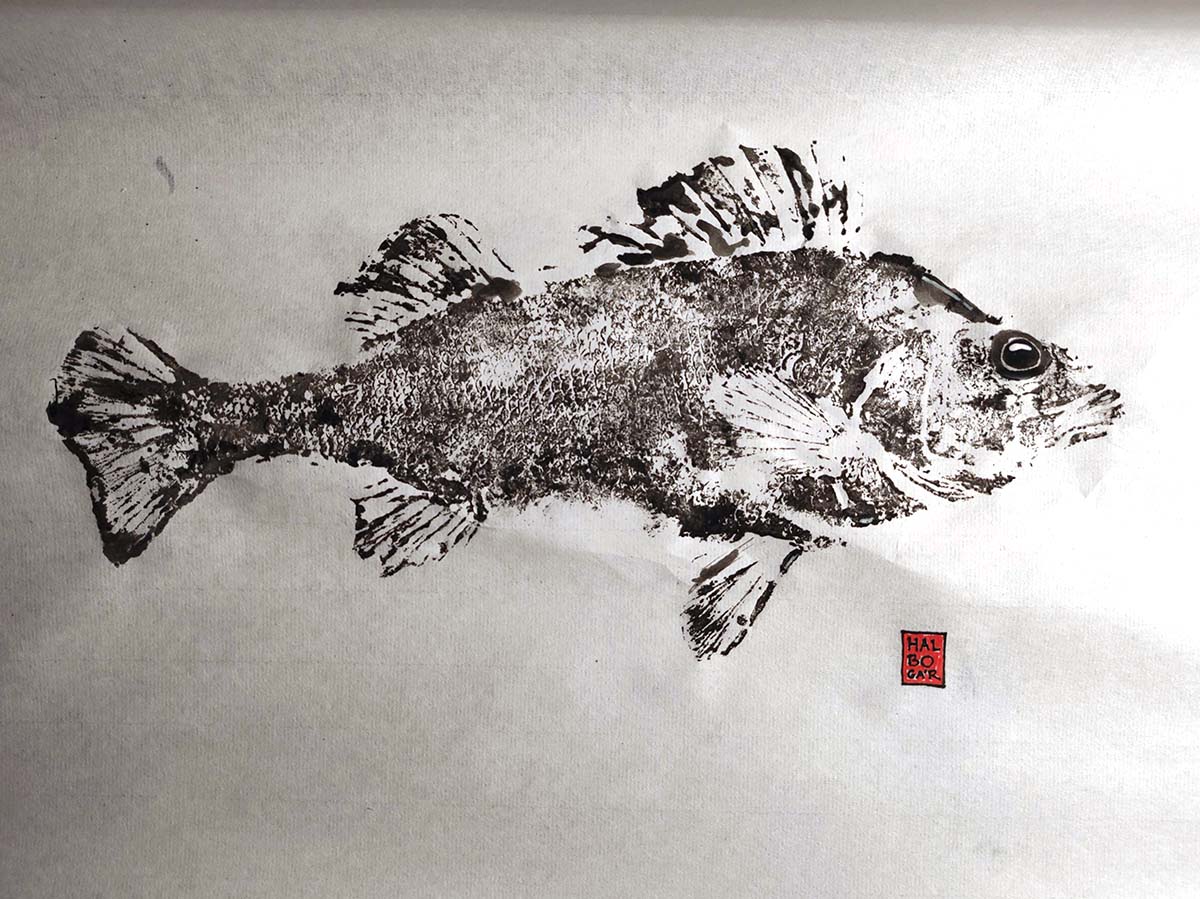 Először hazai ragadozóhalakkal kezdtem. Egy-egy konyhára szánt, vagy a horgot túl mélyre nyelt halról vettem lenyomatot tintával, akrilfestékkel. Sügér, süllő és kősüllő nyomatok készültek el, nem kifejezetten fogás-dokumentálásként. Sokkal inkább látványos és tudományos szempontból is helytálló ábrákat szerettem volna kapni hazai halfajainkról. Most már a képeket – hűen az eredeti módszerhez – tintahaltintával készítem, eredeti kalligráfia papírra.